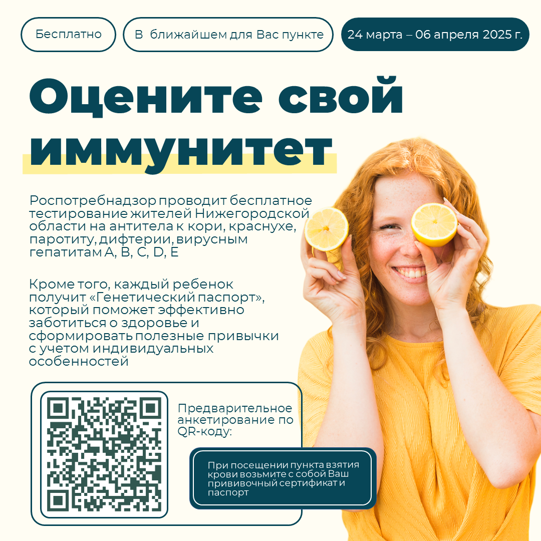 В период с 24 марта по 6 апреля жители Нижегородской области смогут бесплатно проверить свой иммунитет к кори, краснухе, паротиту, дифтерии, вирусным гепатитам А, В, С, D, Е и другим инфекциям, участвуя в программе Роспотребнадзора.